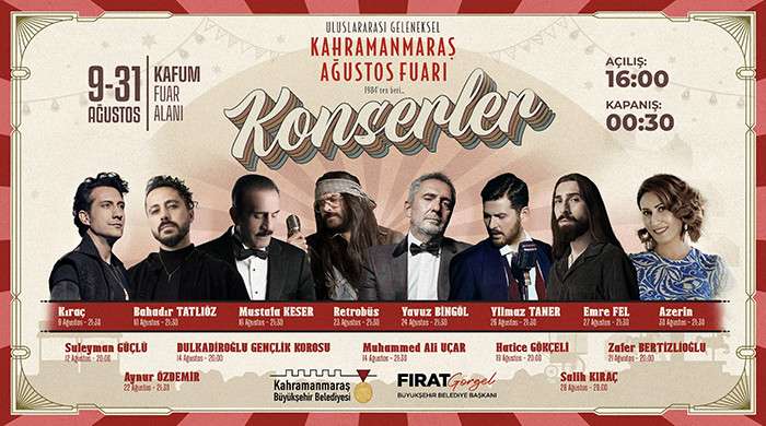 Etkinlik takvimi kapsamında fuar boyunca bir dizi konser düzenlenecek. 10 Ağustos Cumartesi Bahadır Tatlıöz, 12 Ağustos Pazartesi Süleyman Güçlü, 14 Ağustos Çarşamba Dulkadiroğlu Gençlik Korosu ve Muhammed Ali Uçar, 16 Ağustos Mustafa Keser, 19 Ağustos Pazartesi Hatice Gökçeli, 21 Ağustos Çarşamba Zafer Bertizlioğlu, 22 Ağustos Perşembe Aynur Özdemir, 23 Ağustos Cuma Retrobüs, 24 Ağustos Cumartesi Yavuz Bingöl, 26 Ağustos Pazartesi Yılmaz Taner, 27 Ağustos Salı Emre Fel, 28 Ağustos Çarşamba Salih Kıraç ve 30 Ağustos Cuma günü Azerin, Kahramanmaraş’ta müzik ziyafeti yaşatacak.